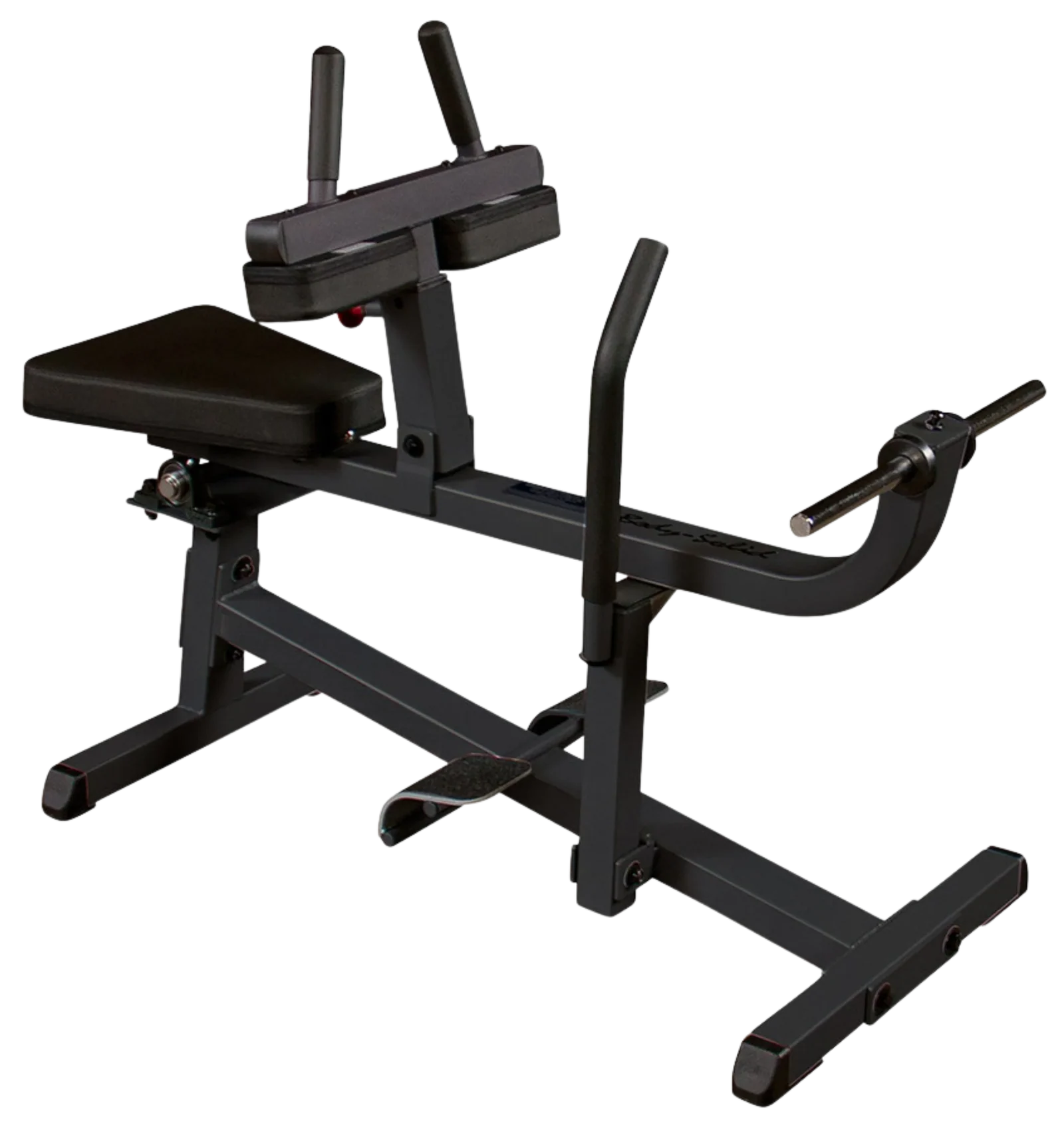 A combination of user-friendly ergonomic design and advanced biomechanical engineering, the GSCR349 was created to increase calf muscle interaction and speed the rate of development. This is achieved by the use of a unique foot platform design that eliminates stress compression on the ball of the foot while providing maximum range of motion for deep muscle fiber penetration. The weight carriage is designed for a 3:1 weight ratio and pivots on precision pillow block and sealed ball bearings for smooth friction-free movement through heavy-duty calf-blasting workouts. In order to carry the heaviest loads, the main frame is constructed of 2″ x 3″ 11-gauge high-tensile strength steel, making the GSCR349 perfect for high traffic, heavy use gyms and clubs. Super-durable, full 3″ thick DuraFirm™ padding supplies the comfort even during workouts with enormous poundage. The Body-Solid Lifetime In-Home Warranty and Full Commercial Warranty back the best calf machine in the industry.Olympic Adapter Sleeves, weight plates, and collars optionalOperates on a 3:1 weight ratio for developing powerful calves. Pillow block bearings at main pivot points for ultra smooth movement under the heaviest loads. Thick, comfortable DuraFirm™ knee pads and seat pad. Angled foot platform with no-slip surface for full range of motion. Adjustable for all size users. Assembled Dimensions: 39″H x 47″L x 20”W