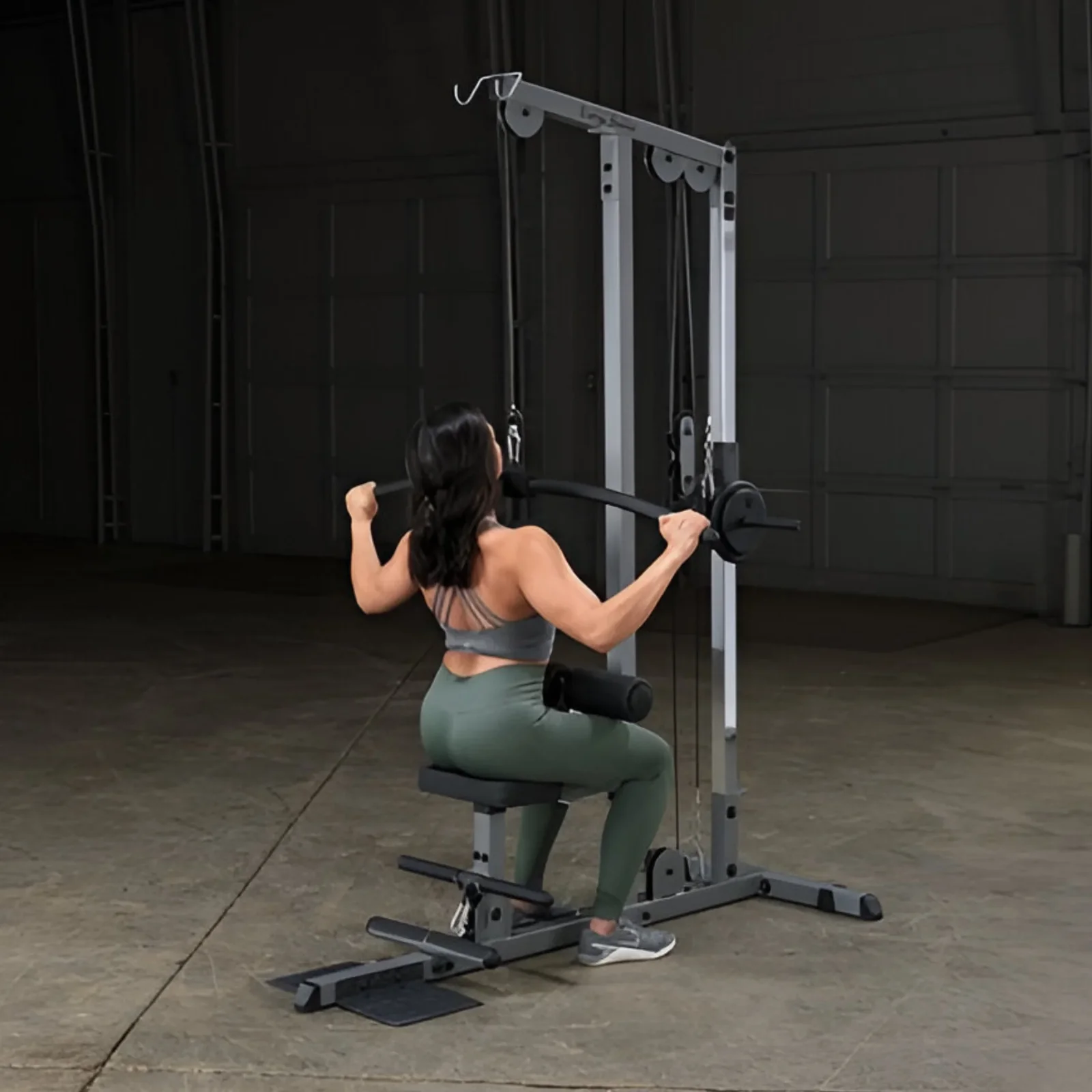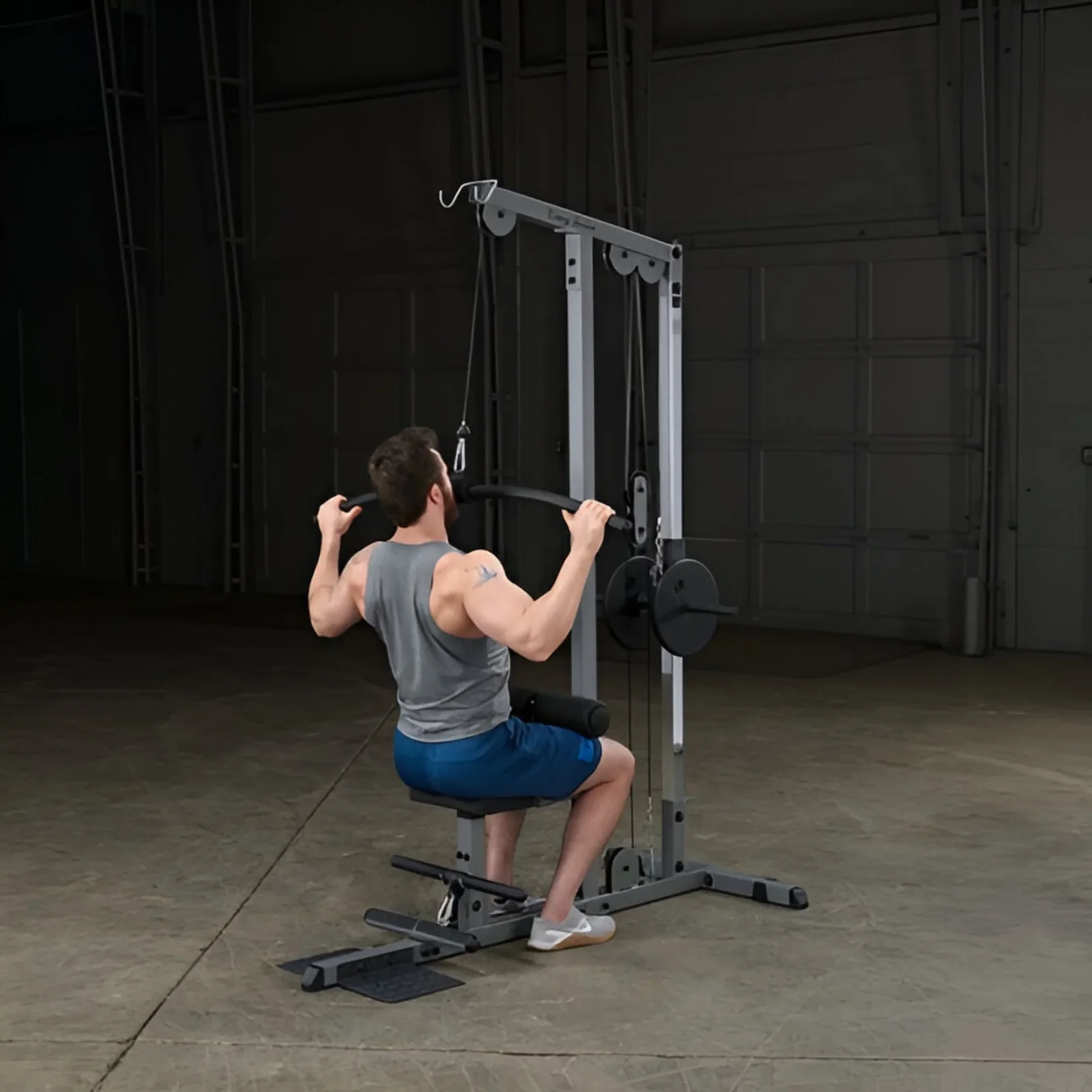 The Body-Solid GLM85B Pro Lat Machine is a plate-loaded strength training tool designed for effective upper body development, targeting lats, shoulders, biceps, and rear deltoids with smooth, biomechanically correct motion. It features a multi-grip, extra-long lat bar for varied hand positions to hit different muscle groups, and a diamond-plate footplate for secure footing during intense pulls. The fully adjustable seat and contoured chest pad ensure a comfortable, secure fit, while the heavy-duty frame provides commercial-grade durability for home or gym use. Ideal for lat pulldowns, tricep pushdowns, and low rows, it allows progressive loading with Olympic plates for customizable resistance without the need for a spotter.