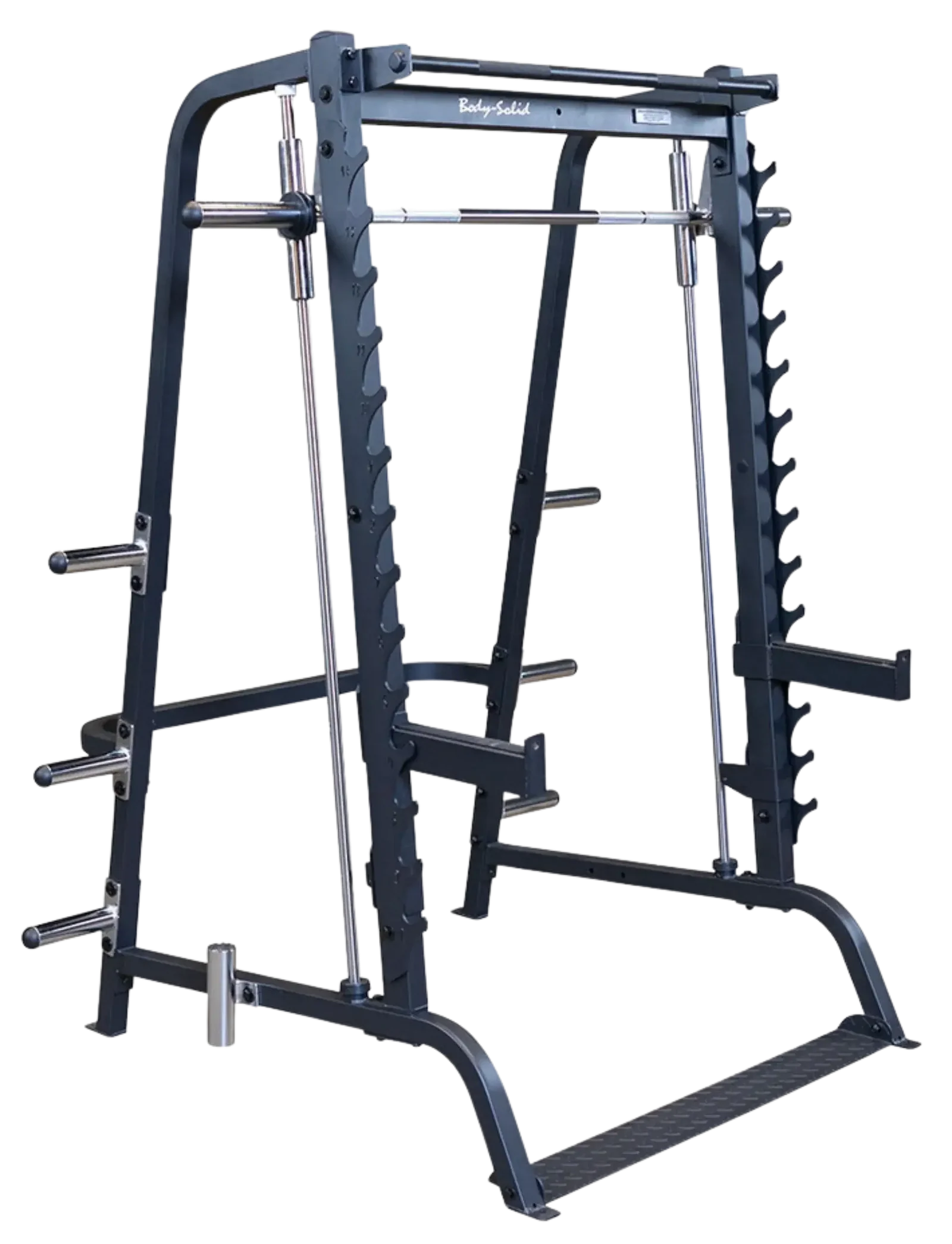 The Body-Solid GS348B Series 7 Linear Bearing Smith Machine is a premium, commercial-grade strength trainer featuring a patented Super-Glide Smith bar with 20 linear ball-bearing rollers for ultra-smooth, precise movement. It combines a full power rack with integrated lat pull-down and low pulley stations for versatile full-body workouts, including squats, bench presses, rows, and curls. The multi-grip chin bar and adjustable safety spotters ensure secure, spotter-free training, while the heavy-duty 3×3″ 11-gauge steel frame supports intense sessions. Ideal for home or commercial gyms, it offers plate-loaded versatility with Olympic plate compatibility for progressive resistance.