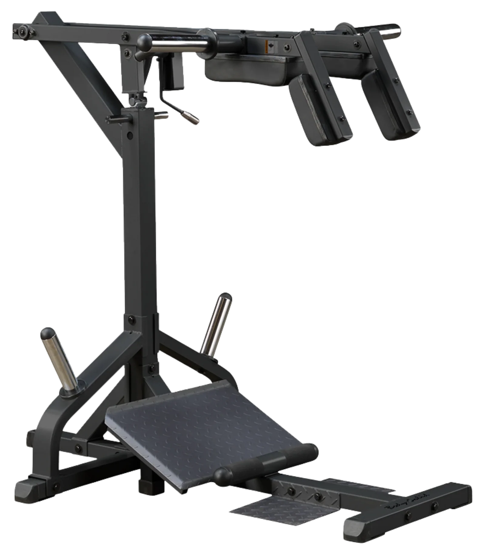 The Body-Solid GSCL360B Leverage Squat Calf Machine is engineered for maximum lower body strength development, targeting thighs, glutes, calves, and lower back while minimizing injury risk. It features a heavy-duty design with a 20° pitched diamond plate foot platform for optimal quad and glute engagement, and an innovative round calf raise block that provides a deep pre-stretch without discomfort for effective calf workouts. The spring-loaded lockout handle ensures user safety, and extra-thick DuraFirm shoulder and back pads offer contoured support during heavy lifts. Ideal for home or commercial use, it handles massive workloads with plate-loaded versatility for squats, calf raises, and shrugs.
