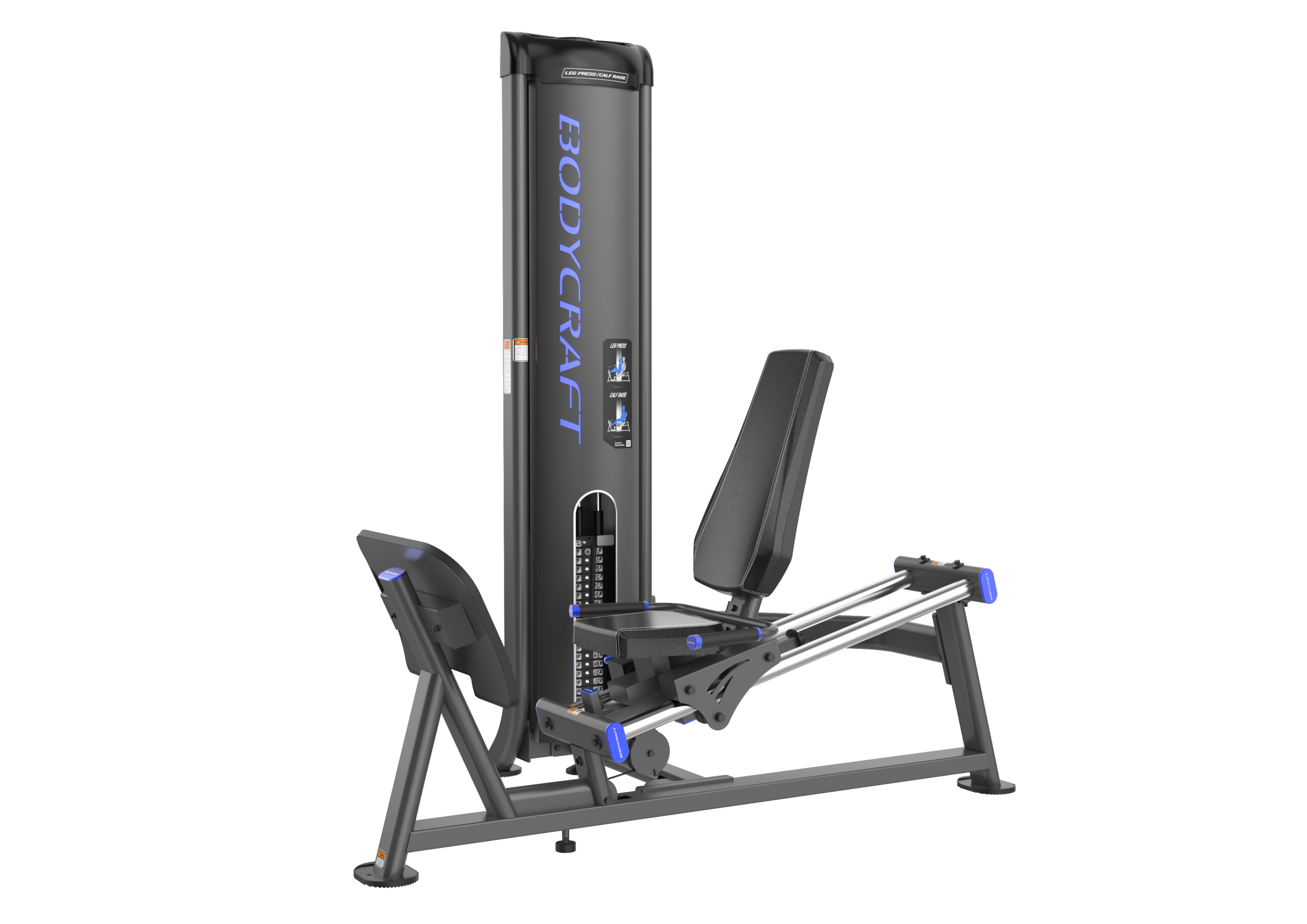 The BODYCRAFT EXP Series DLP-200 combines leg press and calf raises with 5-position adjustable seat carriage, convex footplate for alignment, and 2″ rollers on chrome rails. 11-gauge steel frame and 200 LB weight stack with 1:2 ratio for 400 lbs resistance, upgradeable to 250 LB.