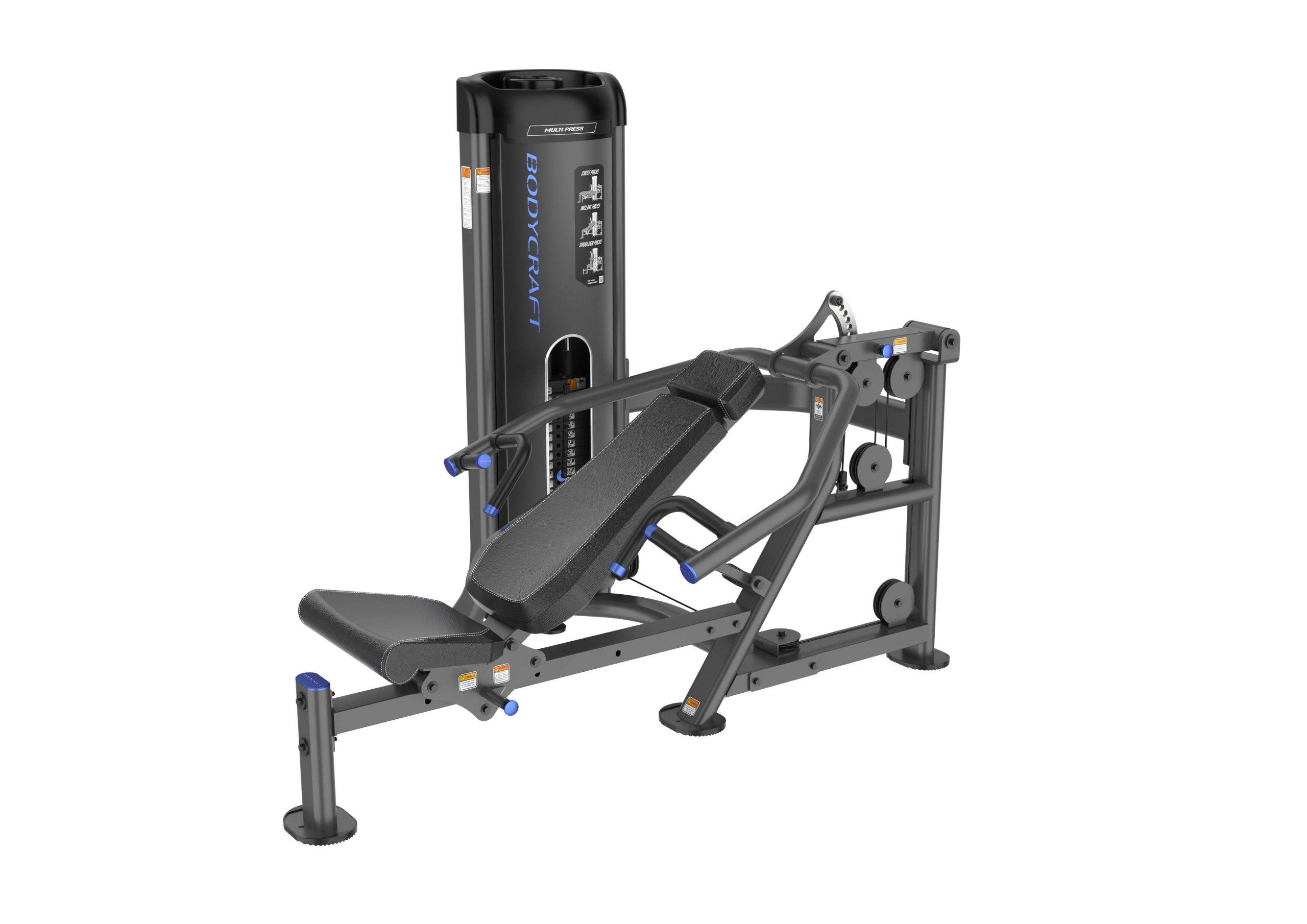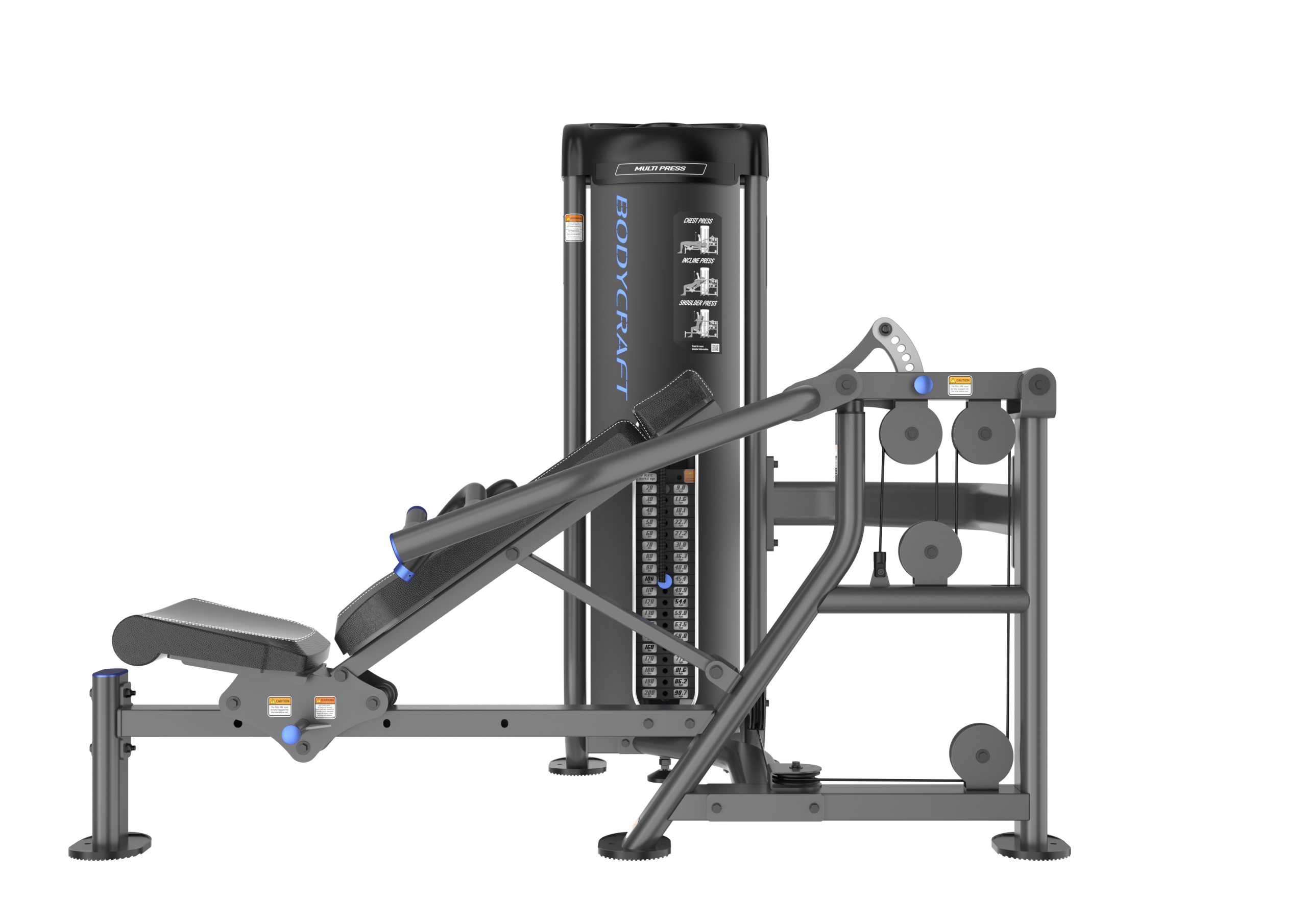 The BODYCRAFT EXP Series DMP-200 supports diverse pressing exercises with multi-grip bar, ergonomic three-piece seat pad, and roller-style seat assembly. Durable 11-gauge steel frame and 200 LB weight stack upgradeable to 250 LB.