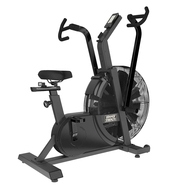 The Hammer Strength HD Air Bike is a durable, high-performance trainer designed for warmups, HIIT, injury prevention, and recovery. It features a belt-drive system for smooth motion, multi-grip handlebars, an adjustable AirGuard for directing airflow, and an LCD console displaying metrics like time, speed, calories burned, RPM, watts, and heart rate. The bike includes an adjustable seat, phone holder, transport wheels, and is self-powered with two D cell batteries. It is built for extreme durability, accommodating a max user weight of 350 lbs, and comes in high wear charcoal grey. Delivery and professional assembly are available, with in-home installation timelines of 5-7 weeks or 16-18 weeks depending on the option.