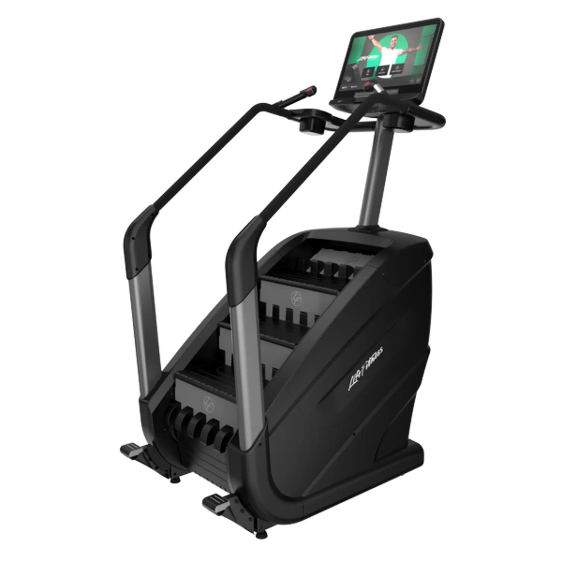 The Life Fitness PowerMill Climber is a premium commercial stair climber delivering smooth, low-impact cardio workouts with a motor-driven SureStepSystem™ for reliable operation across 26 resistance levels and speeds from 26 to 174 steps per minute. It features the largest usable step space in the industry (205 sq. in.) with an anti-toe-pinch design for secure footing during intense or moderate sessions, making it ideal for users of all fitness levels. Compatible with SE4 and SL consoles for customizable interfaces, it includes an integrated smartphone accessory tray with removable cup holders. Powered by a 4.0 HP AC motor, it ensures quiet, durable performance in gyms or facilities, supporting up to 400 lbs with a minimum 9 ft. ceiling height.